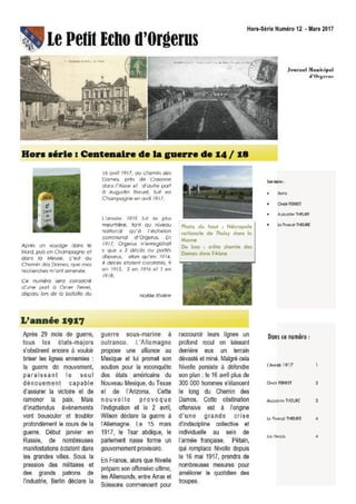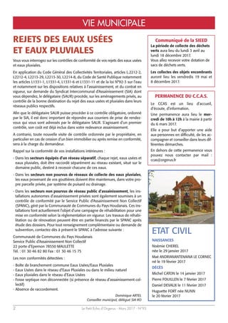 Le numéro de mars 2017 du Petit Écho d'Orgerus annonce des événements municipaux importants, dont des élections présidentielles et législatives. Il prévoit également des campagnes de sensibilisation sur le contrôle des eaux usées et pluviales, ainsi que des initiatives de soutien aux associations locales. D'autres informations incluent un hommage à Mohamed Maïna et un rappel des services disponibles au CCAS.