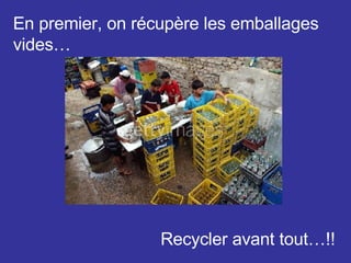 Le document décrit le processus de production et de distribution du Pepsi au Maroc, mettant l'accent sur le recyclage des emballages et l'importance de l'hygiène. Il souligne l'utilisation de recettes secrètes transmises de génération en génération, ainsi que des technologies avancées pour garantir la qualité. Enfin, il aborde le conditionnement et la distribution vers les revendeurs agréés.
