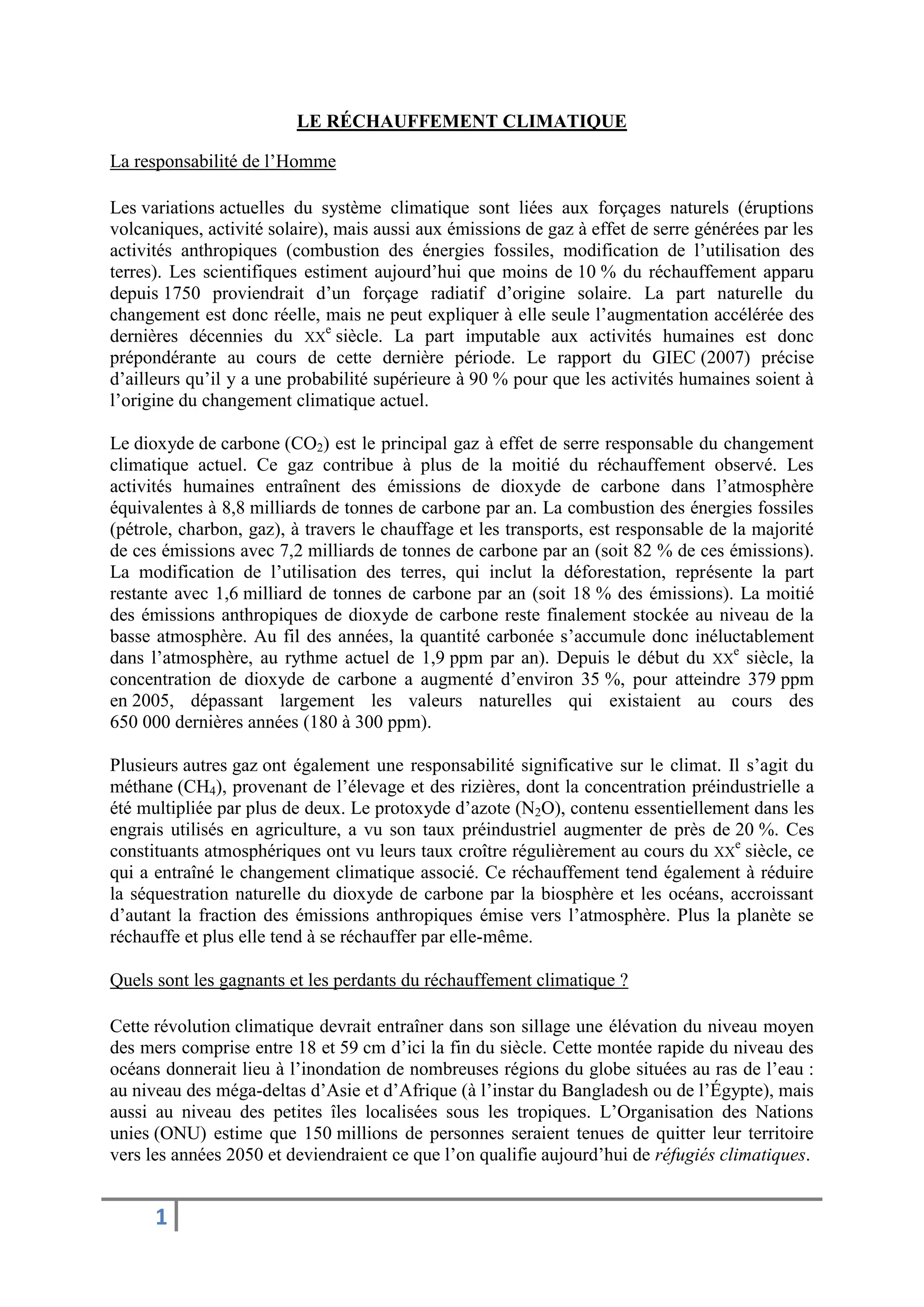 Le réchauffement climatique est en grande partie causé par les activités humaines, avec le dioxyde de carbone comme principal gaz à effet de serre. Les pays du Sud seront les plus affectés par ses conséquences, notamment l'élévation du niveau de la mer et la sécurité alimentaire, tandis que certains pays industrialisés pourraient en tirer profit. Des solutions technologiques et des efforts individuels sont nécessaires pour atténuer ce problème, mais une prise de conscience collective est essentielle.