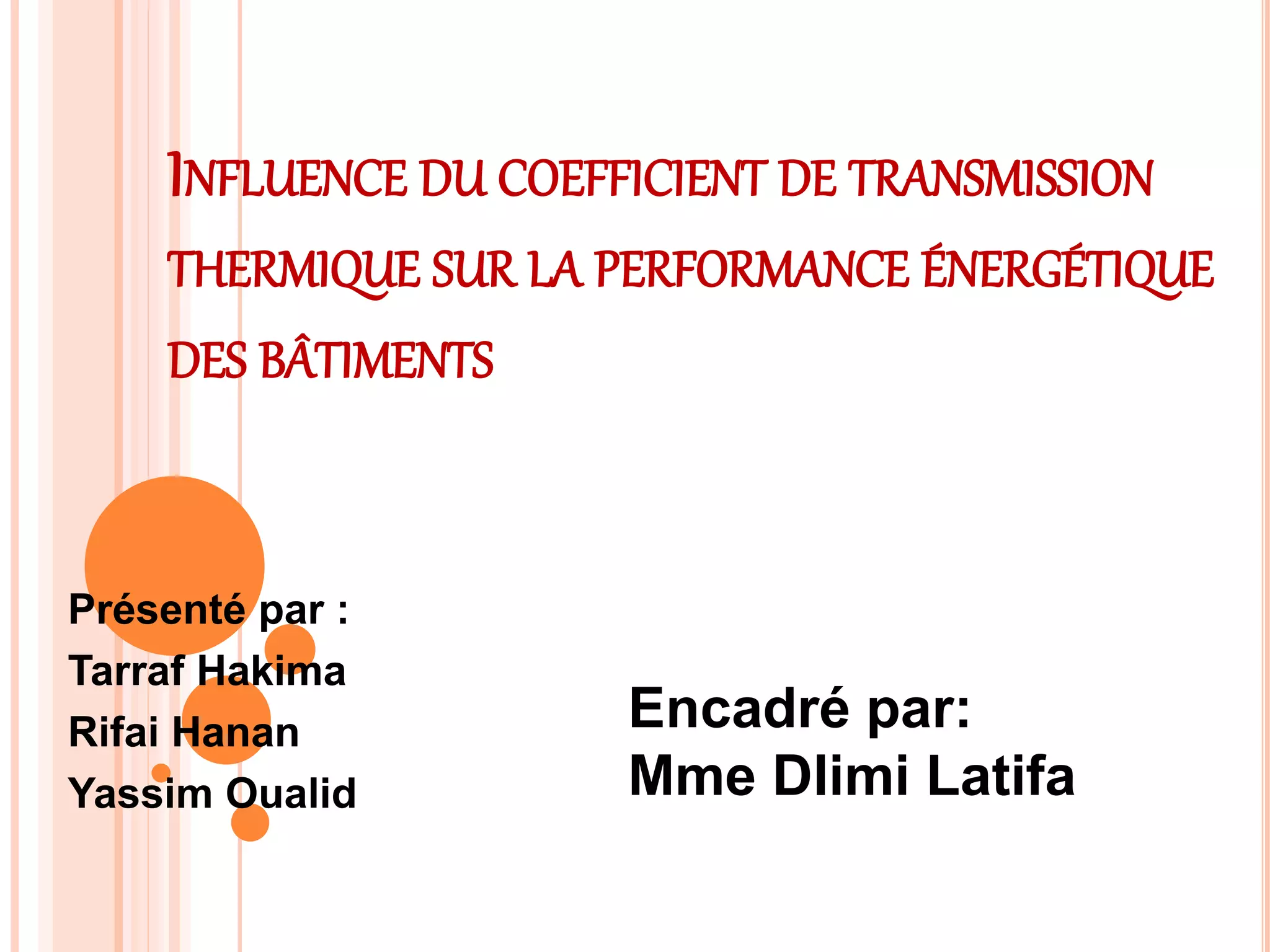 Le document traite de l'influence du coefficient de transmission thermique sur la performance énergétique des bâtiments, en expliquant comment ce coefficient détermine la quantité de chaleur perdue à travers les parois. Il détaille les méthodes de calcul et de mesure des coefficients de transmission thermique pour les fenêtres, portes et façades légères, ainsi que l'impact des ponts thermiques. Enfin, il souligne l'importance d'une bonne isolation pour améliorer l'efficacité énergétique des bâtiments.