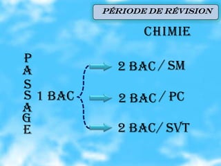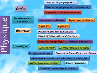 Le document aborde divers concepts de chimie et de physique tels que les ondes mécaniques, la radioactivité, les réactions chimiques, la concentration des solutions, et la conductivité. Il inclut des équations et des lois fondamentales, ainsi que des exemples de dosages acido-basiques et d'oxydoréduction. Les informations sont présentées de manière détaillée pour aider à la révision pour le bac.