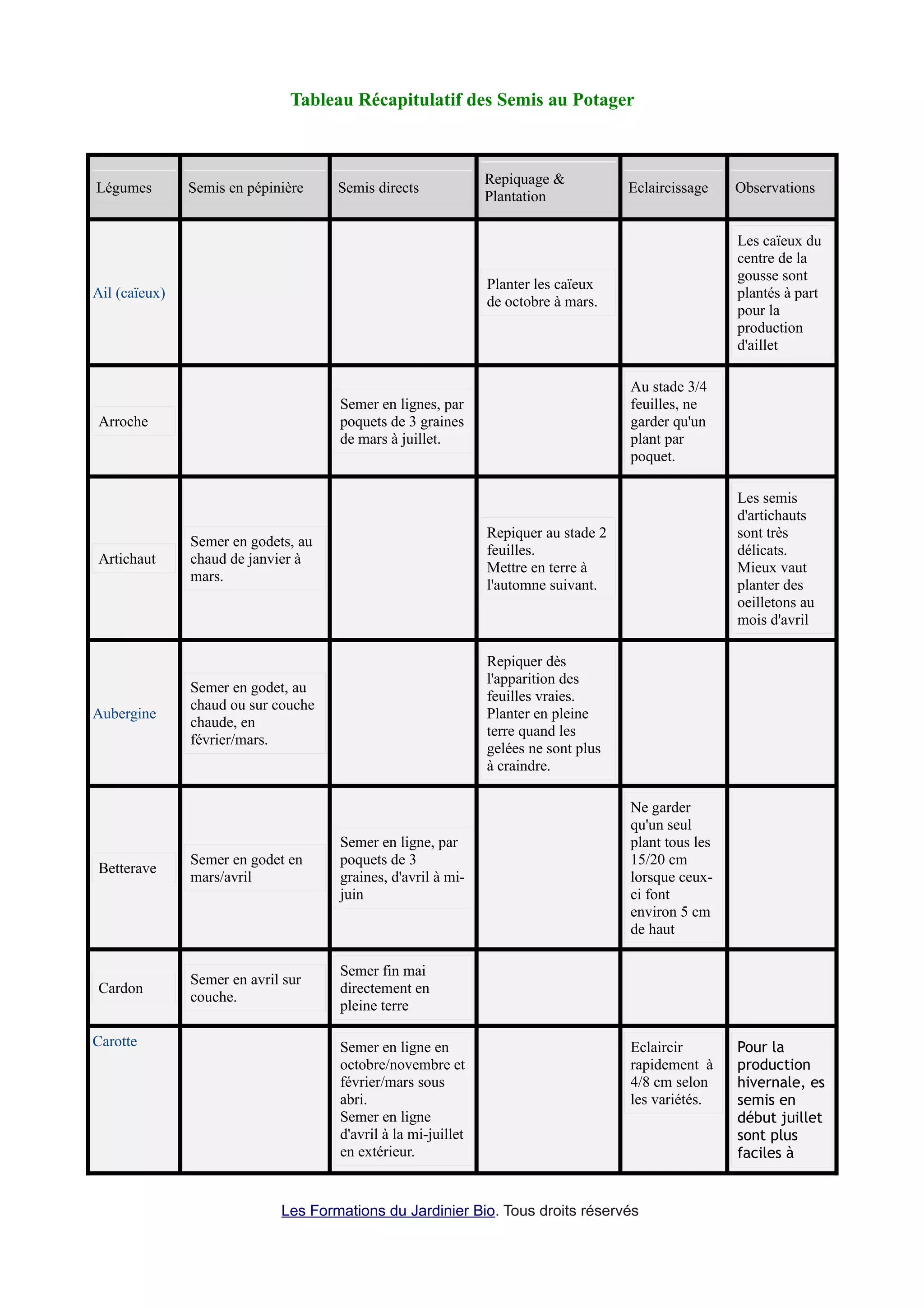 Le document présente un tableau récapitulatif des semis au potager, détaillant les périodes et méthodes de semis, repiquage et éclaircissage pour divers légumes. Chaque légume est accompagné d'observations spécifiques pour optimiser la culture. Les informations couvrent une large gamme de légumes, de l'ail aux tomates, soulignant l'importance des conditions climatiques et des soins à apporter.