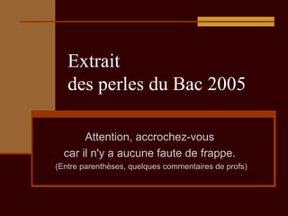 Le document présente une collection humoristique d'erreurs et de perles de candidats lors du bac 2005, où des interprétations comiques et absurdement erronées de faits historiques et scientifiques sont partagées. Chaque perle est accompagnée d'un commentaire léger d'un professeur, soulignant l'incongruité et le manque de rigueur dans certaines réponses. Ces anecdotes offrent un aperçu divertissant des difficultés rencontrées par les étudiants dans leur compréhension des sujets abordés.