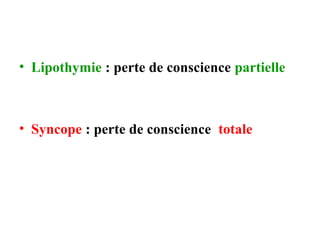 Le document discute des pertes de connaissance, en se concentrant sur les types tels que la lipothymie et la syncope, ainsi que leurs causes possibles, notamment cardiaques, vasculaires, neurologiques et métaboliques. Il détaille également les examens cliniques, les interrogatoires, et les approches thérapeutiques en cas de pertes de connaissance. Des cas cliniques sont présentés, illustrant le processus diagnostique et les éventuelles conduites à tenir.