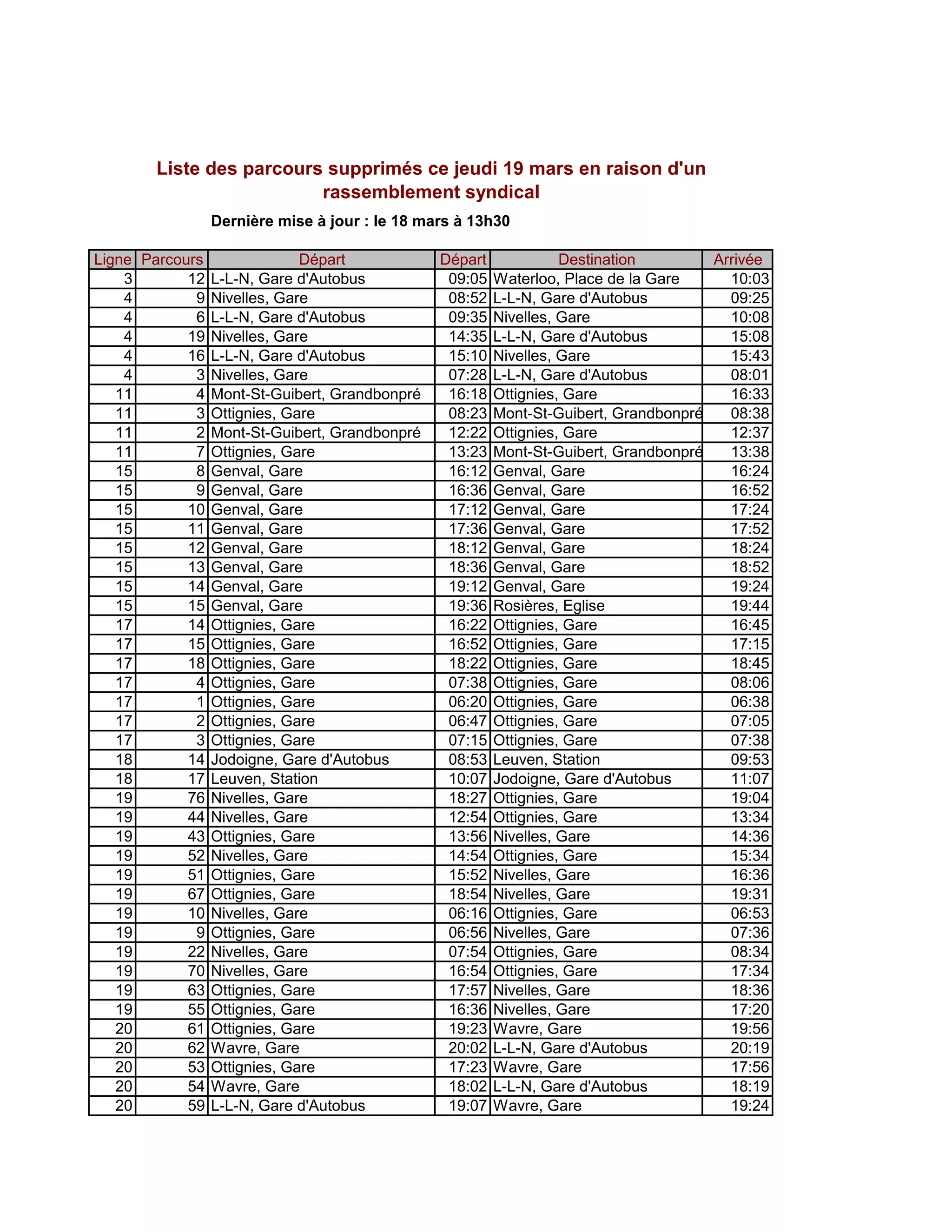 Le document présente un emploi du temps des départs de bus et de train, avec des horaires et des destinations à partir de diverses gares. Des informations sur des parcours supprimés en raison d'un rassemblement syndical sont également fournies. Les horaires vont du matin jusqu'à tard en soirée, indiquant les connexions entre les différentes villes.