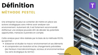 La méthode PESTEL permet d'analyser le macro-environnement d'une entreprise en évaluant les facteurs politiques, économiques, sociaux, technologiques, environnementaux et légaux. Elle s'avère utile pour identifier les opportunités et menaces qui influencent la viabilité des actions stratégiques. Cette analyse est recommandée tant dans le cadre professionnel qu'universitaire pour mieux comprendre l'évolution des conditions externes.