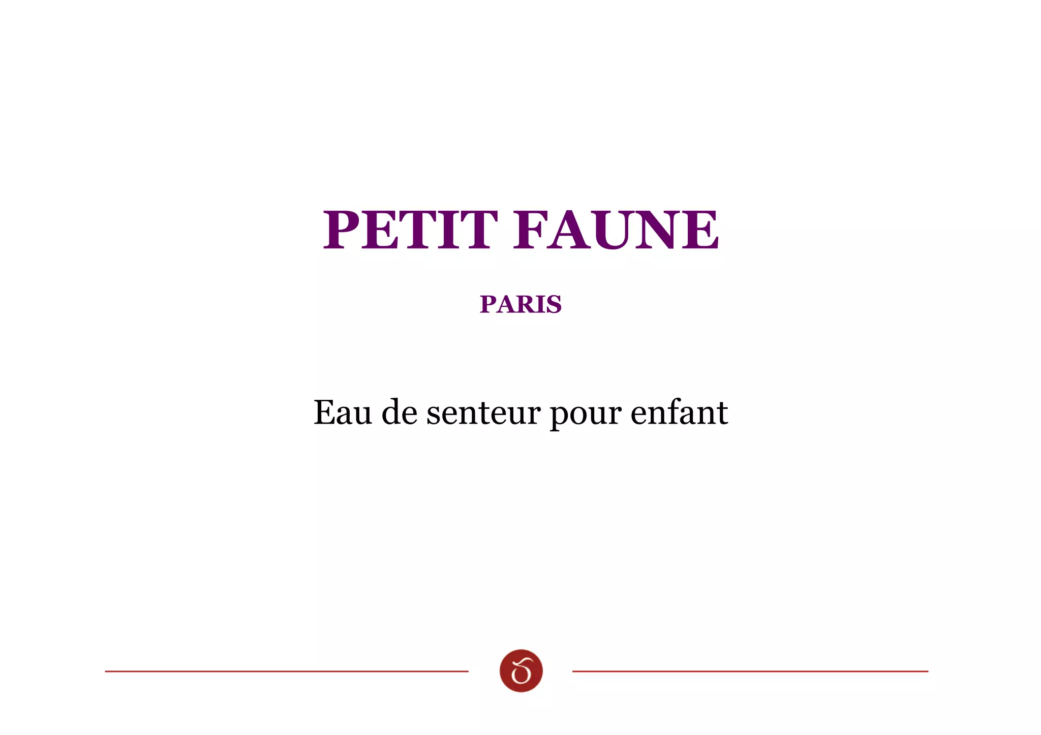 Le document présente 'Petit Faune', une eau de senteur pour enfants évoquant des souvenirs d'enfance et l'odeur apaisante de la mère. La fragrance commence par des agrumes et des aromates, suivie de fleurs délicates, pour se terminer par des notes chaleureuses de vanille et de musc. Ce parfum vise à capturer l'émotion et la pureté de la tendresse infantile.