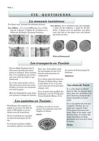Le document est un petit journal rédigé par des élèves de CE2 sur la Tunisie et ses institutions, la vie quotidienne, et la culture. Il décrit des aspects variés tels que le système politique, l'armée, les transports, la monnaie, la gastronomie et la faune. Ce numéro est dédié à un élève disparu et inclut des contributions sur différents sujets par plusieurs élèves.