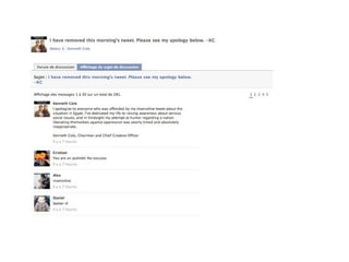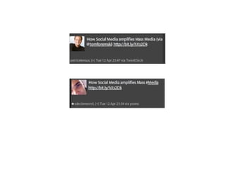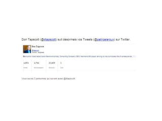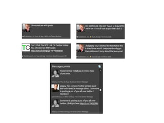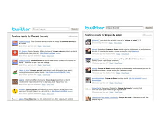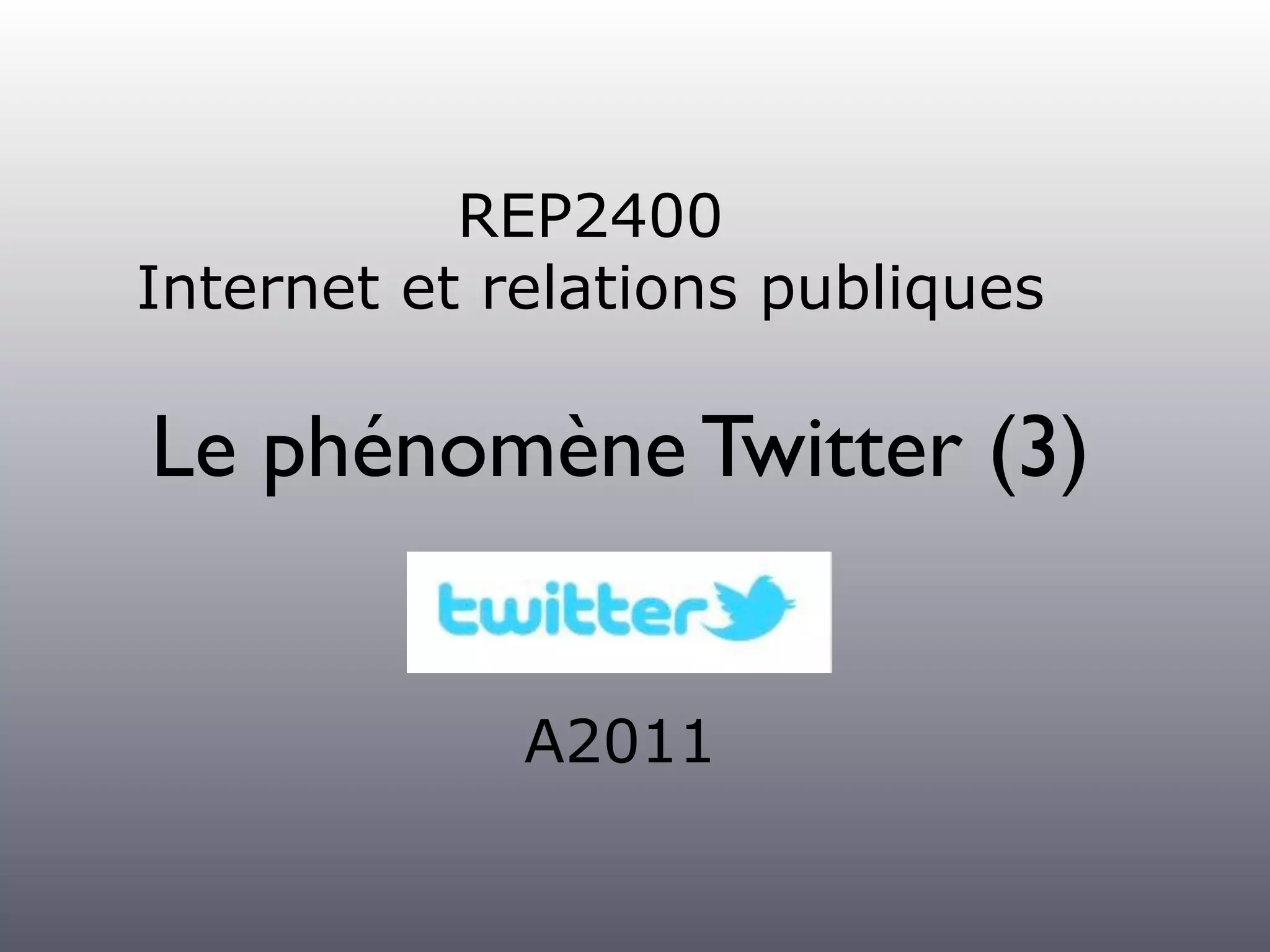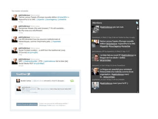 Le document explore l'impact de Twitter sur les relations publiques et la communication en temps réel, soulignant son rôle en tant que moteur de recherche et communauté sociale. Il aborde également les stratégies d'entreprise sur Twitter, les risques liés à son utilisation et l'influence croissante des hashtags dans la promotion d'événements. Des exemples de crises de communication sur Twitter sont fournis, mettant en lumière les enjeux du journalisme et de la gestion de réputation dans l'ère numérique.