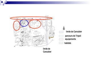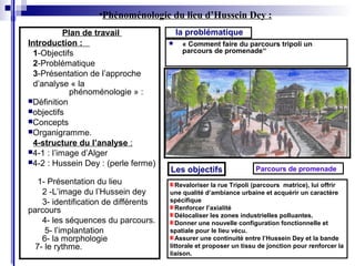 Le document présente une analyse urbaine et architecturale de la rue Tripoli à Hussein Dey, en se basant sur une approche phénoménologique pour revaloriser l'espace. Il met en avant les objectifs d'amélioration de l'ambiance urbaine, la délocalisation des zones polluantes et la création de continuités entre Hussein Dey et la voie littorale. En parallèle, il décrit l'image d'Alger comme une ville à la riche histoire, son développement topologique et les défis liés à son urbanisation moderne.