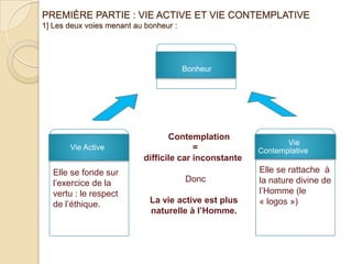 Dans 'L'Éthique à Nicomaque', Aristote guide l'homme vers le bonheur en liant éthique et politique, affirmant que la vertu s'exerce dans un cadre social. Il distingue deux voies vers le bonheur : la vie active, qui repose sur l'exercice de la vertu, et la contemplation, plus difficile à atteindre. Le bonheur est lié à l'acquisition des vertus, à la maîtrise de la vie active et à la sérénité face aux aléas extérieurs.