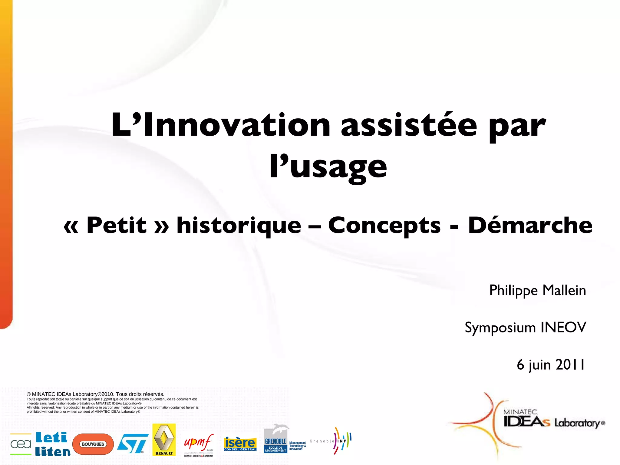 Le document retrace l'historique et l'évolution de l'innovation assistée par l'usage des nouvelles technologies d'information et de communication en France depuis les années 1970. Il présente la méthode Cautic développée pour accompagner la conception d'innovations en intégrant les attentes et besoins des utilisateurs à travers différentes démarches et outils. Enfin, il met en avant le rôle du Minatec Ideas Laboratory dans la conception et le test des concepts d'innovation en se basant sur des critères d'usage et de communauté.