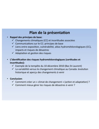 Le document aborde la communication sur le changement climatique, en proposant des principes de base pour sensibiliser et adapter la société face aux risques liés aux aléas hydrométéorologiques. Il met l'accent sur l'importance de comprendre et de gérer l'incertitude scientifique, tout en soulignant les actions à mener pour anticiper les impacts futurs des phénomènes climatiques extrêmes. En conclusion, il insiste sur la nécessité d'évaluer et de réduire les risques en intégrant ces connaissances dans la prise de décision et la prévention des catastrophes.