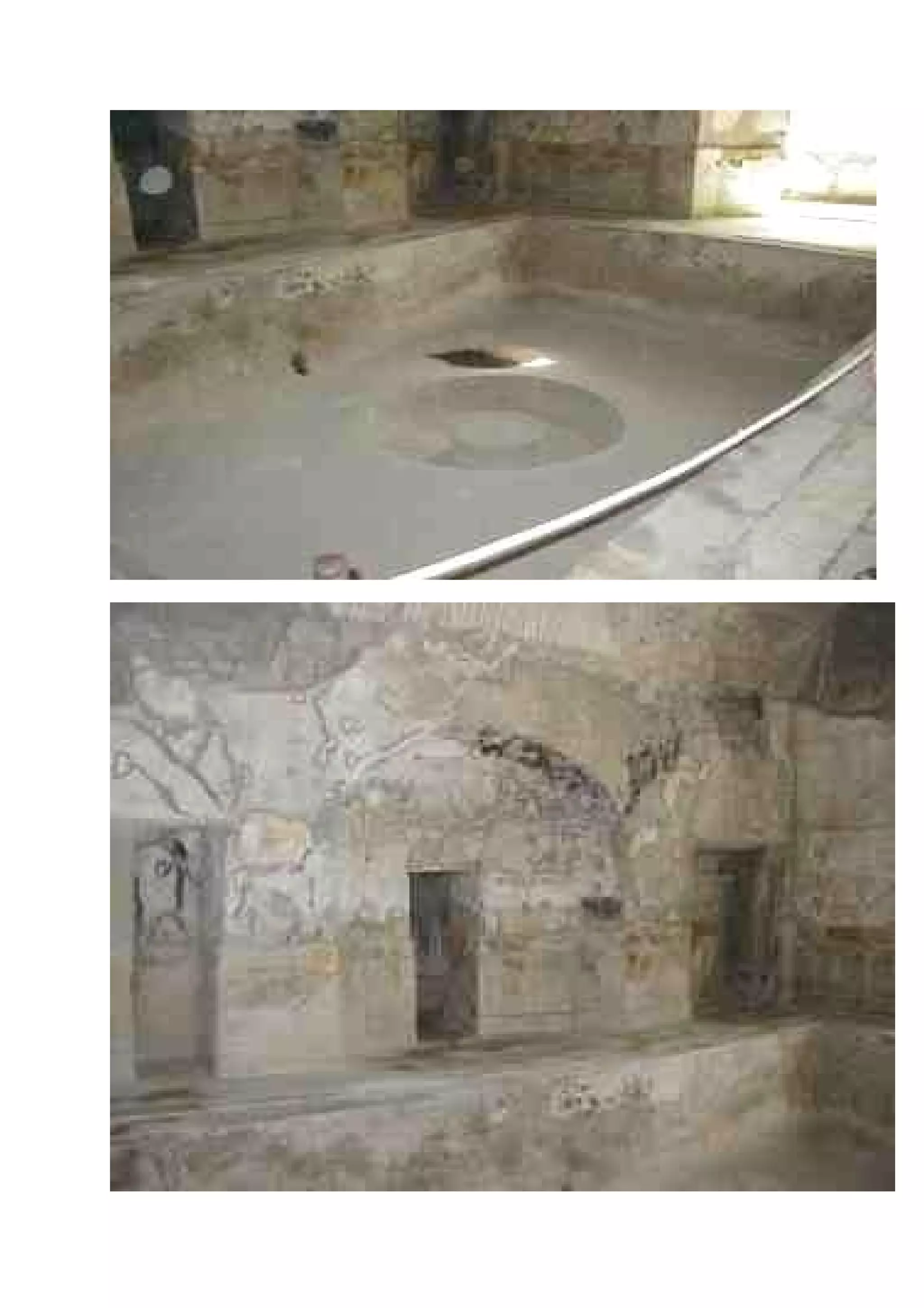 Le document présente les édifices publics de Pompéi et d'Herculanum, mettant en lumière leur rôle dans la politique, l'économie, la justice et les loisirs. Parmi les structures mentionnées, on trouve le forum, le temple d'Auguste, les amphithéâtres et les thermes. Des images et des inscriptions politiques illustrent l'importance de ces bâtiments dans la vie publique de l'époque.