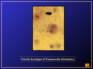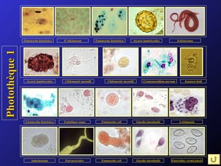 Le document présente une liste variée de protistes et de helminthes, ainsi que leurs étapes de cycle évolutif et morphologie. Il mentionne des organismes tels qu'Entamoeba histolytica, Plasmodium falciparum, et Ascaris lumbricoides. Ce contenu semble axé sur la parasitologie et les différentes formes de ces parasites.