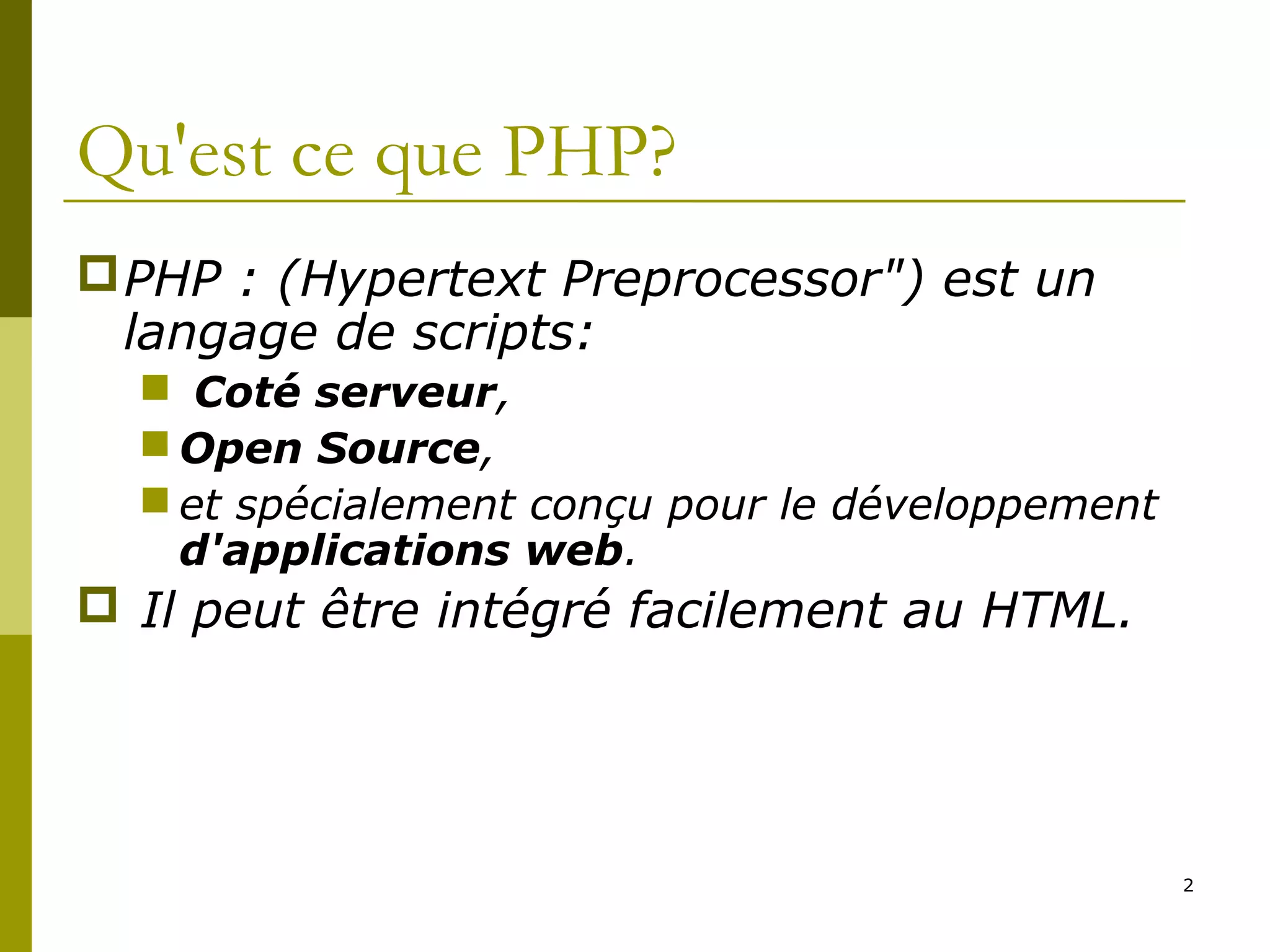 Le document présente PHP, un langage de script côté serveur utilisé pour le développement d'applications web et son intégration avec HTML. Il couvre divers aspects de la syntaxe PHP, y compris les variables, les boucles, les fonctions, les tableaux et son interaction avec les formulaires HTML et MySQL. Des exemples de code illustrent les concepts, facilitant la compréhension et l'application du langage.