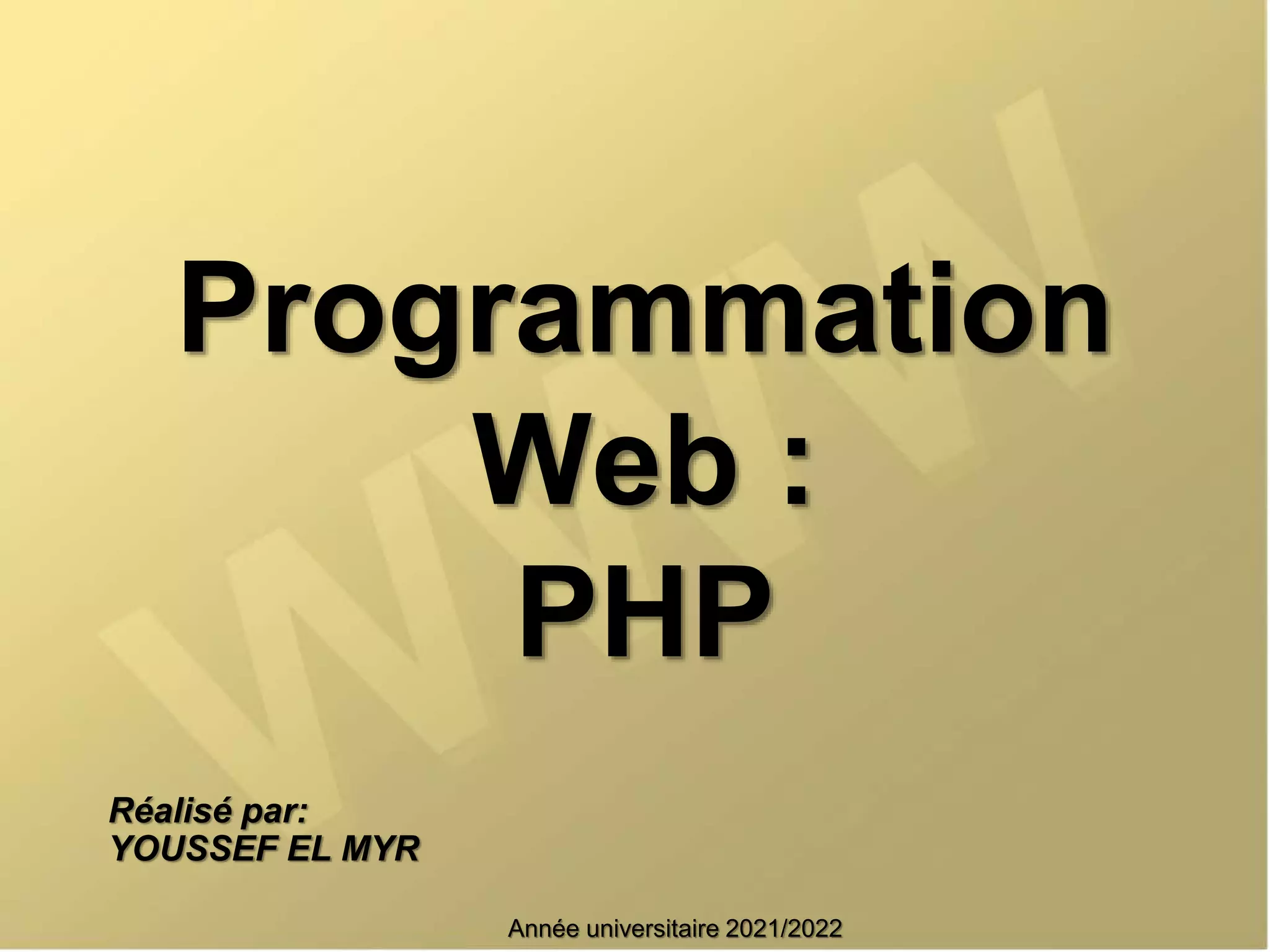 Le document traite de PHP, un langage de script côté serveur permettant de créer des pages web dynamiques et d'interagir avec des bases de données. Il aborde les fonctionnalités de PHP, y compris la manipulation de données, ainsi que les structures de contrôle et les tableaux. Des exemples de code illustrent l'utilisation de PHP pour générer du contenu HTML et traiter des formulaires.