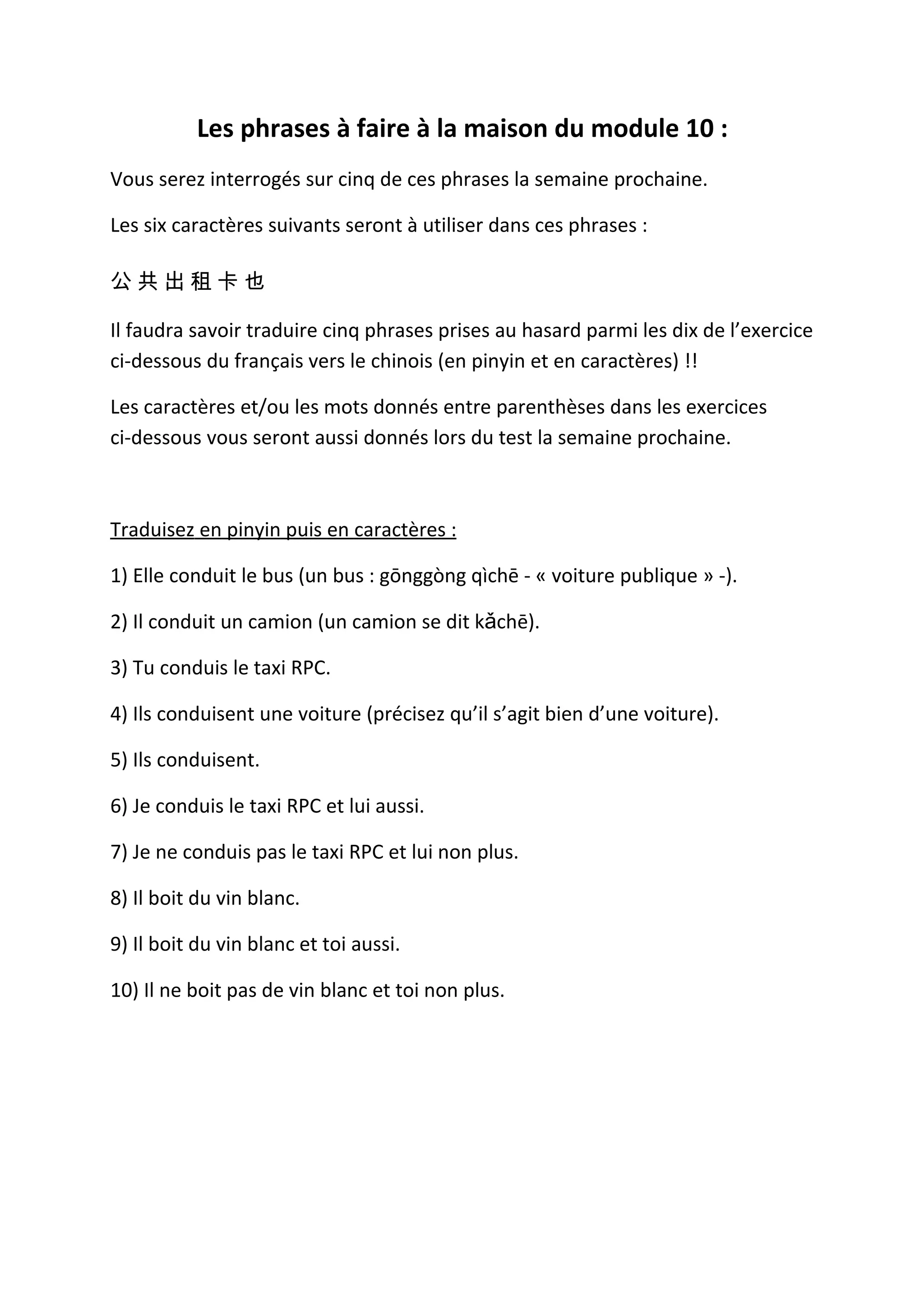 Le document présente un exercice de traduction de phrases du français vers le chinois, avec une préparation pour un test à venir. Les étudiants devront utiliser des caractères spécifiques et traduire cinq phrases au hasard parmi dix. Les phrases comprennent des situations liées à la conduite de divers véhicules et à la consommation de vin blanc.