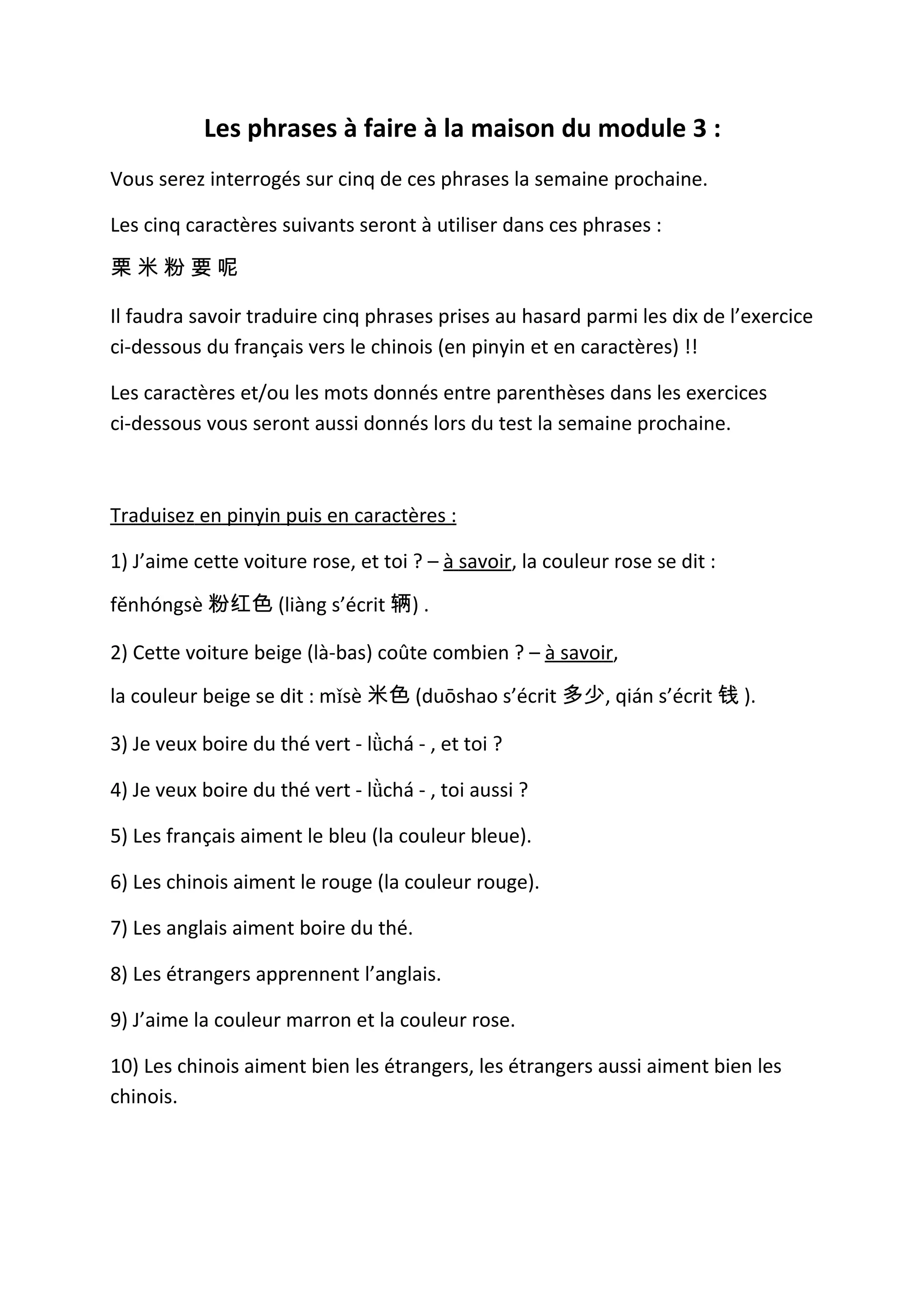 Le document fournit des phrases à traduire du français vers le chinois en pinyin et en caractères pour un examen à venir. Dix phrases sont énumérées, chacune nécessitant une traduction spécifique, avec des notes sur les couleurs et les mots associés. Les étudiants doivent préparer cinq phrases au hasard pour le test.