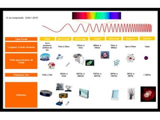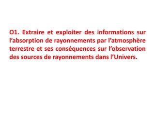 Le document traite de l'absorption des rayonnements par l'atmosphère terrestre et de son impact sur l'observation des sources d'ondes et de particules dans l'univers. Il présente les différents types de rayonnements tels que les ondes électromagnétiques et mécaniques, et explique leur propagation ainsi que des dispositifs de détection associés. Des exemples concrets de capteurs et de phénomènes associés, comme les séismes et les télescopes spatiaux, sont également fournis.