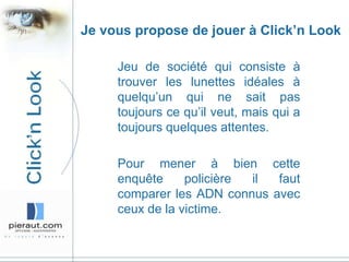 Le document présente 'click'n look', un outil intelligent de présélection de lunettes qui analyse la morphologie et les préférences budgétaires de l'utilisateur pour proposer des montures adaptées. Il décrit également un jeu de société basé sur la recherche des lunettes idéales, en comparant les ADN des montures et des attentes des clients. Enfin, il souligne l'importance de la gestion des stocks et de la communication pour se démarquer des concurrents dans le secteur.