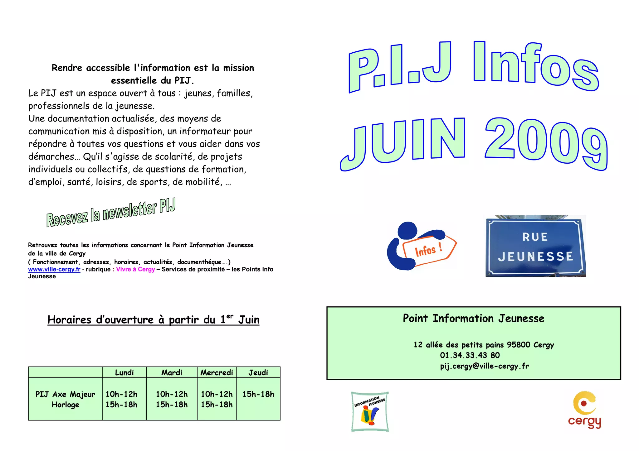 Le Point Information Jeunesse (PIJ) de Cergy offre un accès à des informations sur divers sujets tels que la scolarité, l'emploi et les loisirs pour les jeunes et les familles. Des événements et des rencontres sont organisés pour encourager l'engagement des jeunes dans des missions d'intérêt général. De plus, des festivals et activités sportives sont proposés tout au long de l'année pour favoriser la culture et la solidarité.