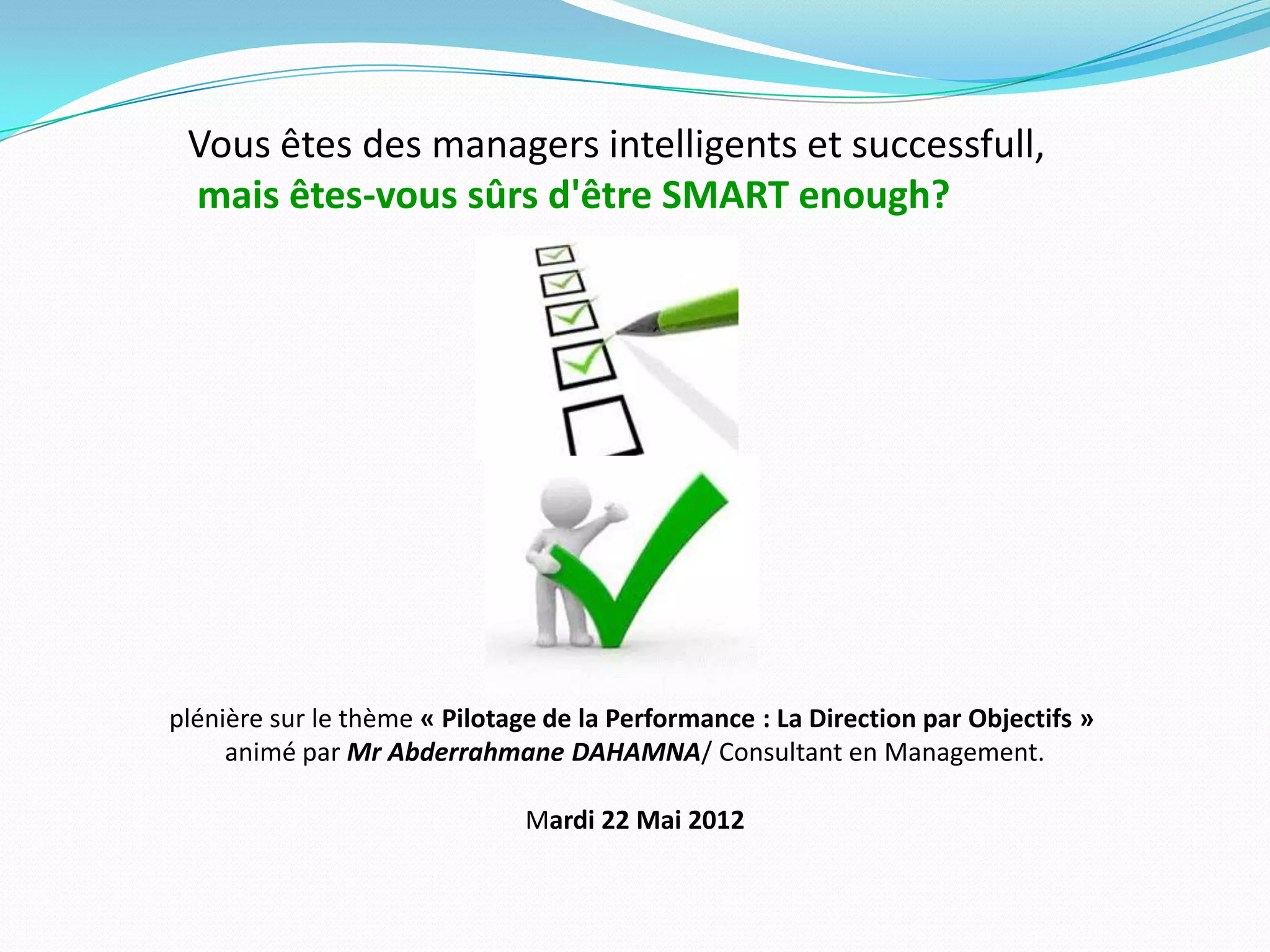 La plénière animée par Abderrahmane Dahamna aborde la gestion par objectifs (GPO), soulignant son historique, ses principes et son importance dans la performance organisationnelle. La GPO permet d'aligner les objectifs individuels des employés avec ceux de l'organisation à travers des systèmes de performance et des indicateurs mesurables. L'utilisation d'outils tels que le tableau de bord de gestion est essentielle pour suivre et optimiser cette performance.