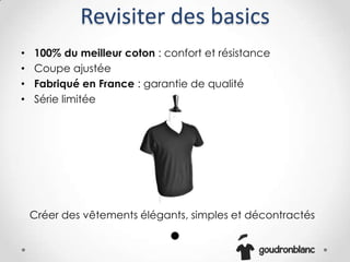 Goudron Blanc propose des vêtements pour homme simples et élégants fabriqués à 100% en coton, avec une coupe ajustée et une production au Portugal. La marque utilise des méthodes de crowdsourcing pour impliquer la communauté dans le design et le financement de sa première collection. Le développement de la marque se fait également à travers sa présence en ligne sur www.goudronblanc.com.