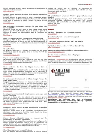 Le document traite de l'actualité liée aux logiciels libres et open source, y compris la publication de code par whitehouse.gov et les implications de la législation sur le droit d'auteur. Il examine également l'utilisation croissante des logiciels libres en tant que bien commun, les avantages de leur adoption par de grandes organisations, et les enjeux économiques associés. Enfin, il souligne la nécessité de sécuriser les applications dans un contexte de menaces numériques croissantes.