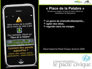 La rencontre 'place de la palabre' se tient chaque mois pour débattre sur divers sujets sociaux et politiques, favorisant l'engagement et la coopération. La prochaine discussion portera sur la parentalité, explorant les relations intergénérationnelles et les défis contemporains. Les échanges favoriseront l'écoute active et le respect des différents points de vue, embrassant la diversité des expériences parentales dans nos sociétés modernes.