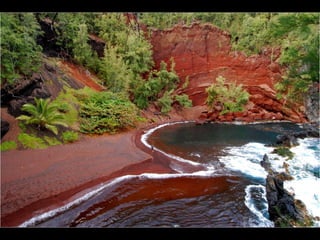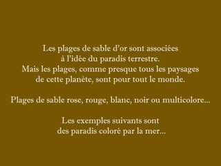 Le document décrit diverses plages aux sables colorés, soulignant leur beauté unique et leur origine géologique. Parmi les exemples, on trouve des plages de sable rose, rouge, blanc, noir, vert et pourpre, chacune ayant des caractéristiques distinctes. Ces plages, telles que Coral Pink Sand Beach et Hyams Beach, sont mises en avant pour leur singularité et leur attrait visuel.
