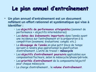 Le document présente un plan annuel d'entraînement et de récupération pour les sports collectifs, décrivant les objectifs de performance et les différents cycles d'entraînement tels que les mésocycles et les phases de préparation. Il aborde également les stades de développement des athlètes, les composantes d'entraînement (physiques, techniques et psychologiques) et l'importance d'une planification structurée pour optimiser la performance. Enfin, il souligne la nécessité d'une évaluation constante et d'une adaptation des méthodes d'entraînement en fonction des besoins des athlètes.