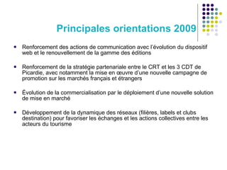 Le plan d'action 2009 du Comité Départemental du Tourisme de la Somme vise à renforcer la communication et la promotion du tourisme, avec des initiatives ciblées sur le développement durable et l'amélioration de l'offre touristique. Les actions comprennent la mise à jour des documents promotionnels, l'optimisation de la présence en ligne, l'organisation d'événements et la collaboration avec des acteurs du secteur pour valoriser les ressources locales. Ce plan se concentre également sur l'amélioration de l'accessibilité et des services aux touristes, en intégrant des initiatives adaptées aux diverses attentes des visiteurs.