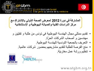 Le document présente le plan d'action de l'association tunisienne de génie biomédical pour 2012, incluant la participation à des salons internationaux et l'organisation de conférences sur l'industrie biomédicale en Tunisie. Il met en avant la formation des étudiants et professionnels, ainsi que la création de ressources comme une médiathèque. Divers ateliers et projets sont également prévus pour renforcer les compétences et la coopération dans le secteur.