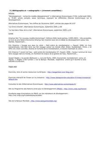 Le document présente le programme d'introduction pour la classe terminale en économie, centré sur les concepts de croissance, changement social et développement. Il explique la distinction entre croissance et développement, ainsi que leur évaluation à travers des indicateurs comme le PIB et l'IDH. Le plan de cours inclut des thèmes tels que les inégalités de développement et les facteurs limitant la croissance, tout en proposant des ressources supplémentaires pour approfondir ces notions.