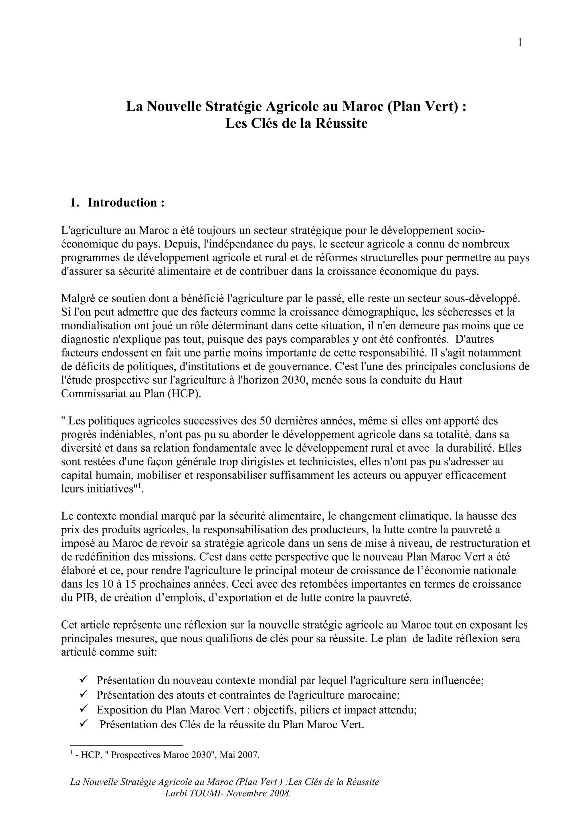 Le document explore la nouvelle stratégie agricole au Maroc, connue sous le nom de plan vert, qui vise à transformer l'agriculture en moteur de croissance économique dans les 10 à 15 prochaines années. Il met en lumière les enjeux mondiaux tels que la sécurité alimentaire et le changement climatique, ainsi que les atouts et contraintes du secteur agricole marocain, tout en soulignant la nécessité de réformes institutionnelles et de politiques publiques adaptées. En conclusion, le plan vert est présenté comme essentiel pour stimuler la croissance du PIB, créer des emplois et lutter contre la pauvreté.