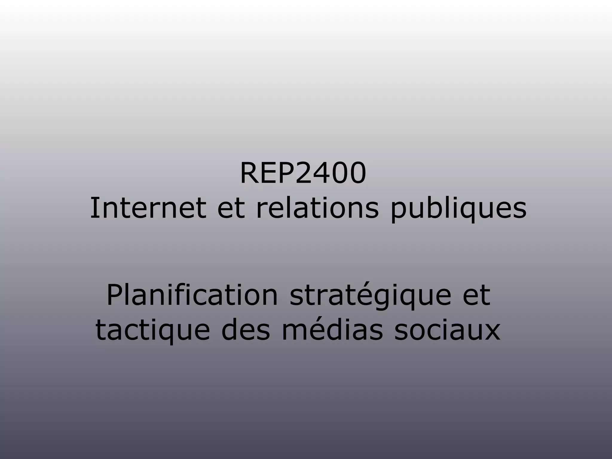 Ce document traite de la planification stratégique et tactique des médias sociaux en lien avec les objectifs corporatifs, soulignant l'importance de la transparence et de l'interaction dans les relations publiques. Il insiste sur la nécessité d'une approche organisationnelle multidisciplinaire, ainsi que sur l'importance d'établir des objectifs SMART pour les stratégies sociales. En outre, il aborde la nécessité de surveiller les actions en ligne et de maintenir une cohérence dans la communication à travers divers canaux.