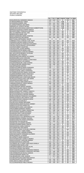 Le document présente une liste d'étudiants de deuxième année pour le cours d'anatomie topographique de 2009, avec leurs notes pour plusieurs semestres. Chaque étudiant est associé à une évaluation sur une échelle de 1 à 7. Les données incluent des moyennes et des scores individuels pour diverses matières.