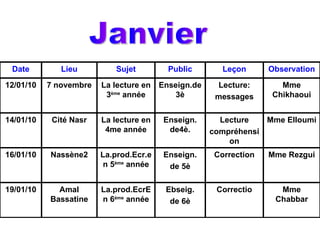 Ce document présente un planning semestriel de formation éducative, détaillant les leçons, les projets de classe et les évaluations des enseignants pour différentes niveaux scolaires de janvier à mai. Les activités incluent la lecture, la compréhension, l'oral, et des remédiations, organisées par différents enseignants à des dates spécifiques. Il reflète un effort d'intégration des TICE et souligne l'importance des projets de classe dans l'apprentissage des élèves.