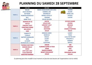 Le document présente le planning du Festiblog 2013 pour le samedi 28 et le dimanche 29 septembre, détaillant les activités organisées dans différentes tentes. Chaque tente accueille divers intervenants et animations, avec la possibilité de modifications selon l'organisation et la météo. Les événements incluent des master classes, des ateliers et des jeux, visant à promouvoir la bande dessinée et l'interaction avec le public.