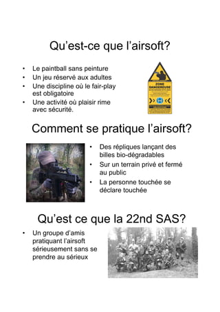 La 22nd SAS est une équipe d'airsoft affiliée à la fédération française d'airsoft, pratiquant un jeu de tir avec des répliques lancant des billes biodégradables sur des terrains privés. L'airsoft est une activité adulte qui prône le fair-play et la sécurité. Composé d'amis, le groupe s'engage dans ce sport de manière sérieuse tout en conservant une atmosphère décontractée.