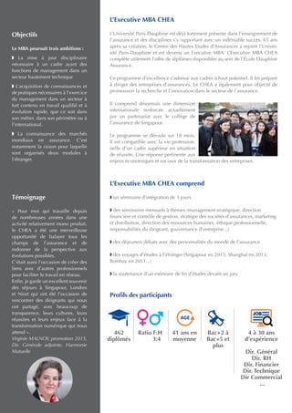 L'Executive MBA CHEA de l'Université Paris-Dauphine, destiné aux cadres dirigeants dans le secteur de l'assurance, a pour objectif d'actualiser les compétences managériales, d'acquérir des connaissances sur les marchés mondiaux, et de promouvoir la recherche dans le domaine. Le programme de 18 mois, incluant des séminaires thématiques, des voyages d'études et un projet de fin d'études, est conçu pour s'adapter aux professionnels en activité. Les candidats doivent répondre à des critères d'expérience professionnelle spécifiques pour être admis au programme.