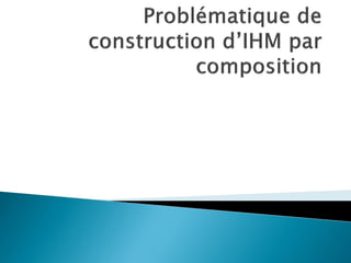 Le document traite de la composition dynamique d'interfaces utilisateur adaptées aux contextes d'utilisation variés, en se basant sur le langage de description d'interface utilisateur XML (UsiXML). Il met en avant des méthodes d'ingénierie pour créer des interfaces plastiques, ainsi que des modèles de composition de composants qui permettent l'adaptation des interfaces selon différents environnements. Des exemples d'applications interactives prêtes à l'emploi, comme la commande de pizzas, illustrent l'approche multimodale présentée.