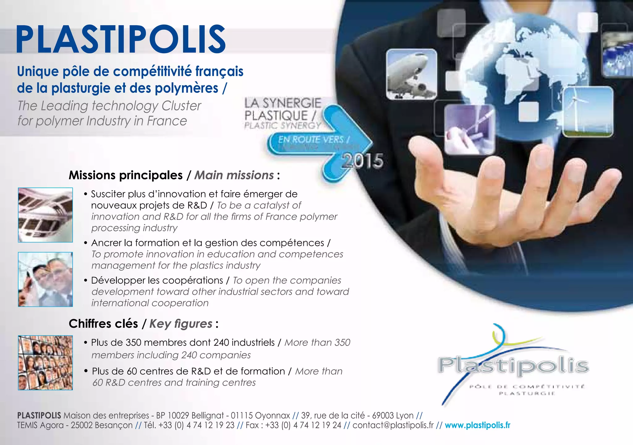 Plastipolis est le pôle de compétitivité français dédié à l'industrie de la plasturgie et des polymères, axé sur l'innovation et le développement de projets de R&D. Il compte plus de 350 membres, dont 240 entreprises, et plus de 60 centres de R&D et de formation. Ses principales missions incluent la promotion de l'innovation, la gestion des compétences et le développement de coopérations industrielles.