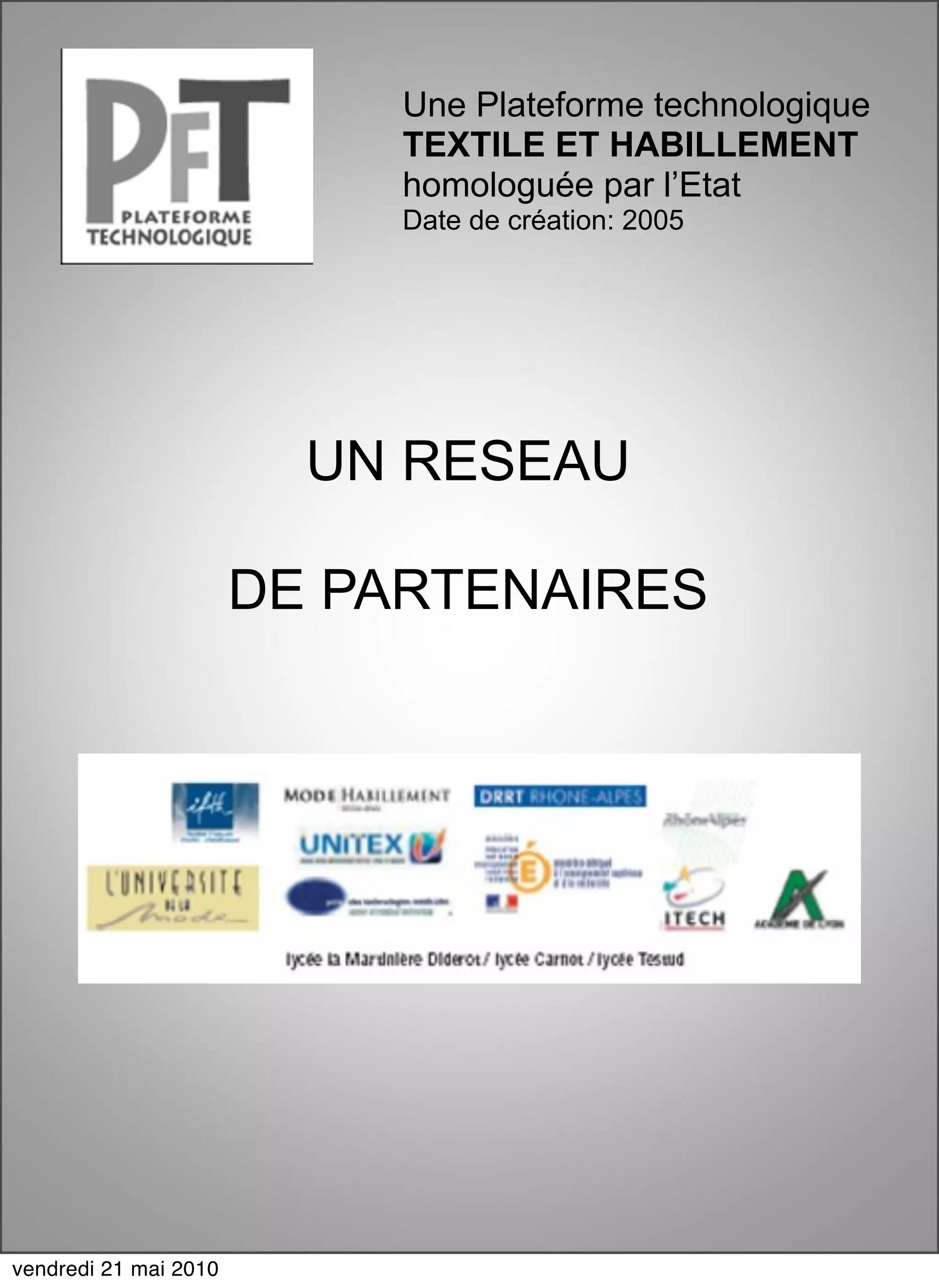 Le document présente une plateforme technologique dans le secteur textile et habillement, créée en 2005 et homologuée par l'État. En 2009, elle a reçu un bilan positif en termes d'innovation et de développement économique, favorisant la collaboration entre l'école et l'industrie. La plateforme a également eu un impact pédagogique significatif en impliquant étudiants et enseignants dans des projets industriels.