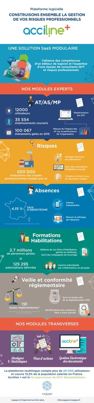 Acciline+ est un ERP qui gère des données dématérialisées liées à la santé, sécurité et environnement, touchant 12,5% de la population salariée en France. Le logiciel offre une veille et une conformité réglementaire pour 2,7 millions de personnes, ainsi que des formations et habilitations. En collaboration avec une équipe de consultants, l'éditeur propose une expertise sur les risques professionnels.