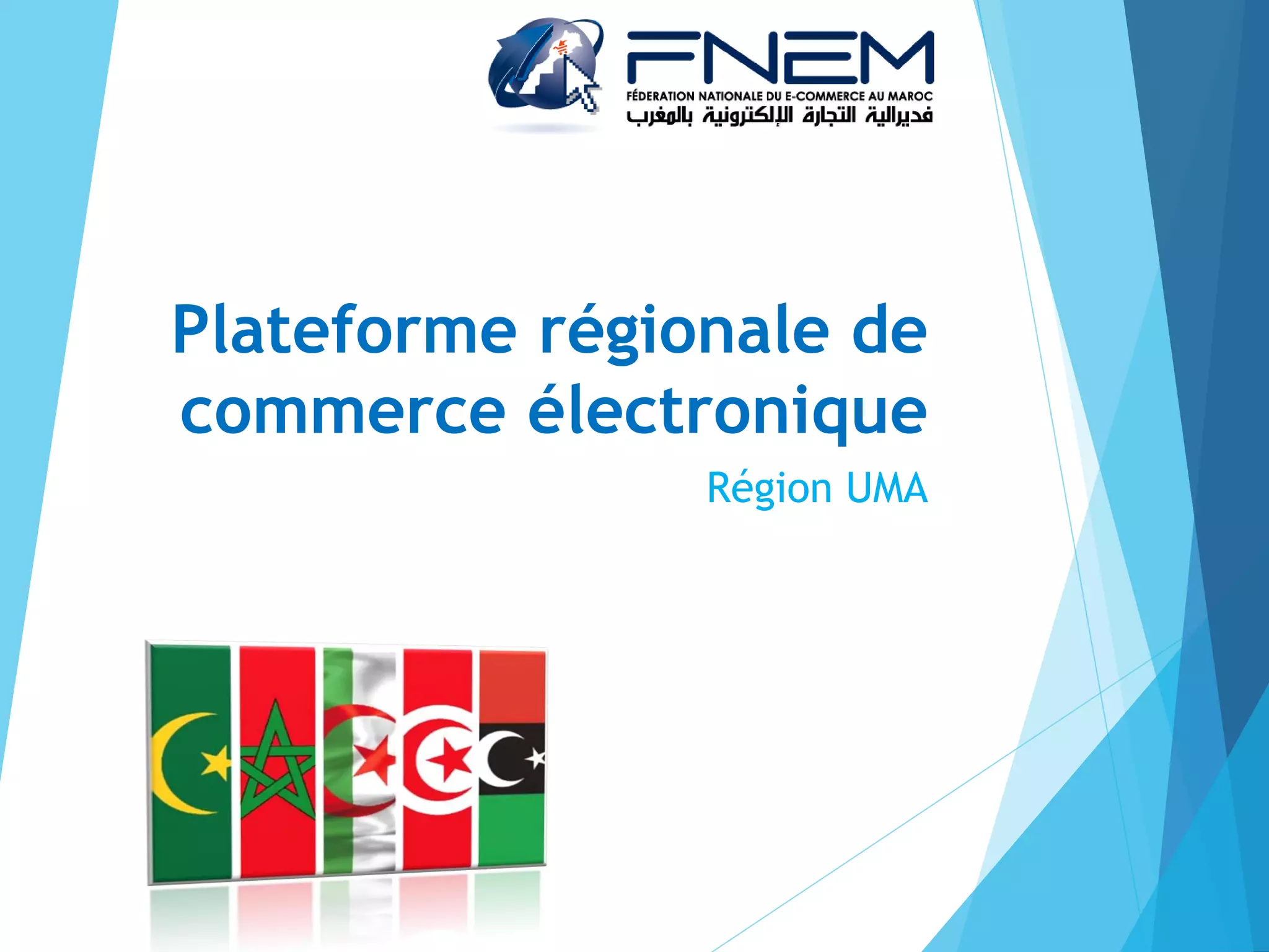 Le document présente une plateforme régionale de commerce électronique pour les pays de l'UMA, visant à améliorer les échanges intermaghrébins en renforçant la logistique, les procédures et la collaboration entre les pays. Malgré des stratégies TIC et des législations existantes, la coopération est insuffisante, entraînant une forte dépendance des échanges avec l'Europe. La plateforme ambitionne de faciliter l'accès au commerce en ligne pour les PME en fournissant des outils d'information et de mise en réseau.