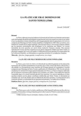 La 'platica' de Fray Domingo de Santo Tomás est l'un des deux seuls exemples de prêche en quechua datant d'avant le Concile de Trente, ayant survécu grâce à son inclusion dans une grammaire publiée en 1560. Cet article analyse la langue générale utilisée dans le texte et le vocabulaire religieux développé pour évangéliser les Indiens, avec une traduction annotée en français. Les annexes comprennent le texte original quechua, des gloses espagnoles et des traductions, illustrant l'effort missionnaire des premiers colonisateurs.