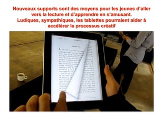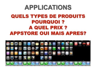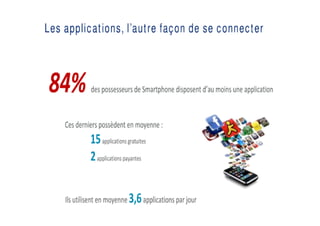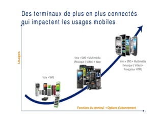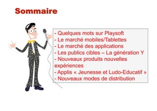 Le document analyse le marché des smartphones et des tablettes, soulignant la forte adoption des nouveaux produits, notamment parmi les jeunes générations. Il présente Playsoft, une entreprise spécialisée dans le développement de contenus et d'applications mobiles, et évoque les tendances récentes du marché, y compris la montée en popularité des iPhones et des applications ludo-éducatives. Enfin, des recommandations sont fournies pour optimiser la création et la distribution de contenus adaptés aux supports numériques.