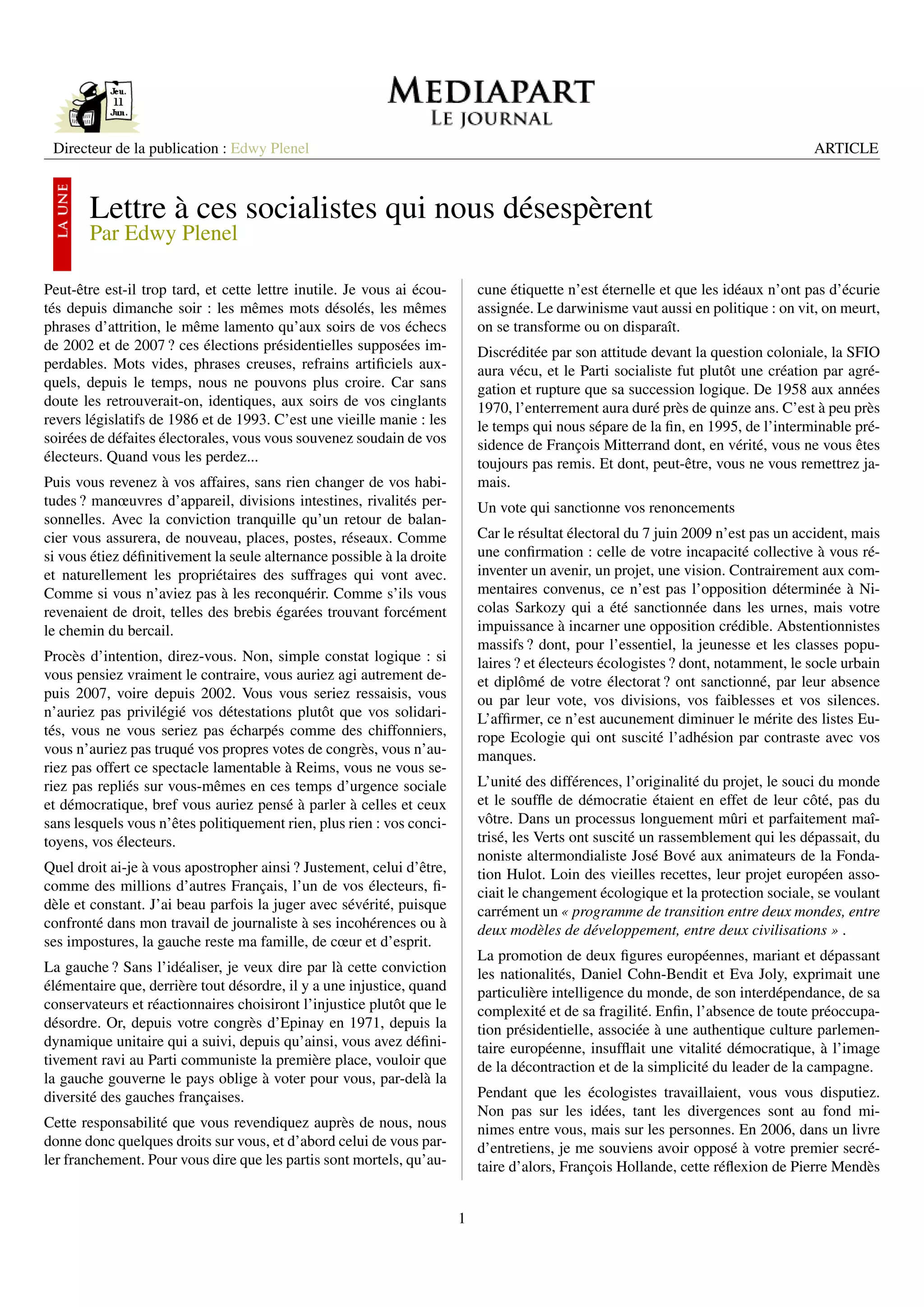 Dans cet article, Edwy Plenel interroge l'incapacité du Parti socialiste français à se réinventer face à ses échecs électoraux et à ses divisions internes. Il insiste sur la nécessité d'une repolitisation et d'une réconciliation avec les classes populaires, ainsi que sur l'importance d'un projet politique cohérent et d'une écoute active des citoyens. Plenel souligne que le socialisme doit évoluer pour rester pertinent à l'heure de la deuxième mondialisation et des crises économiques actuelles.
